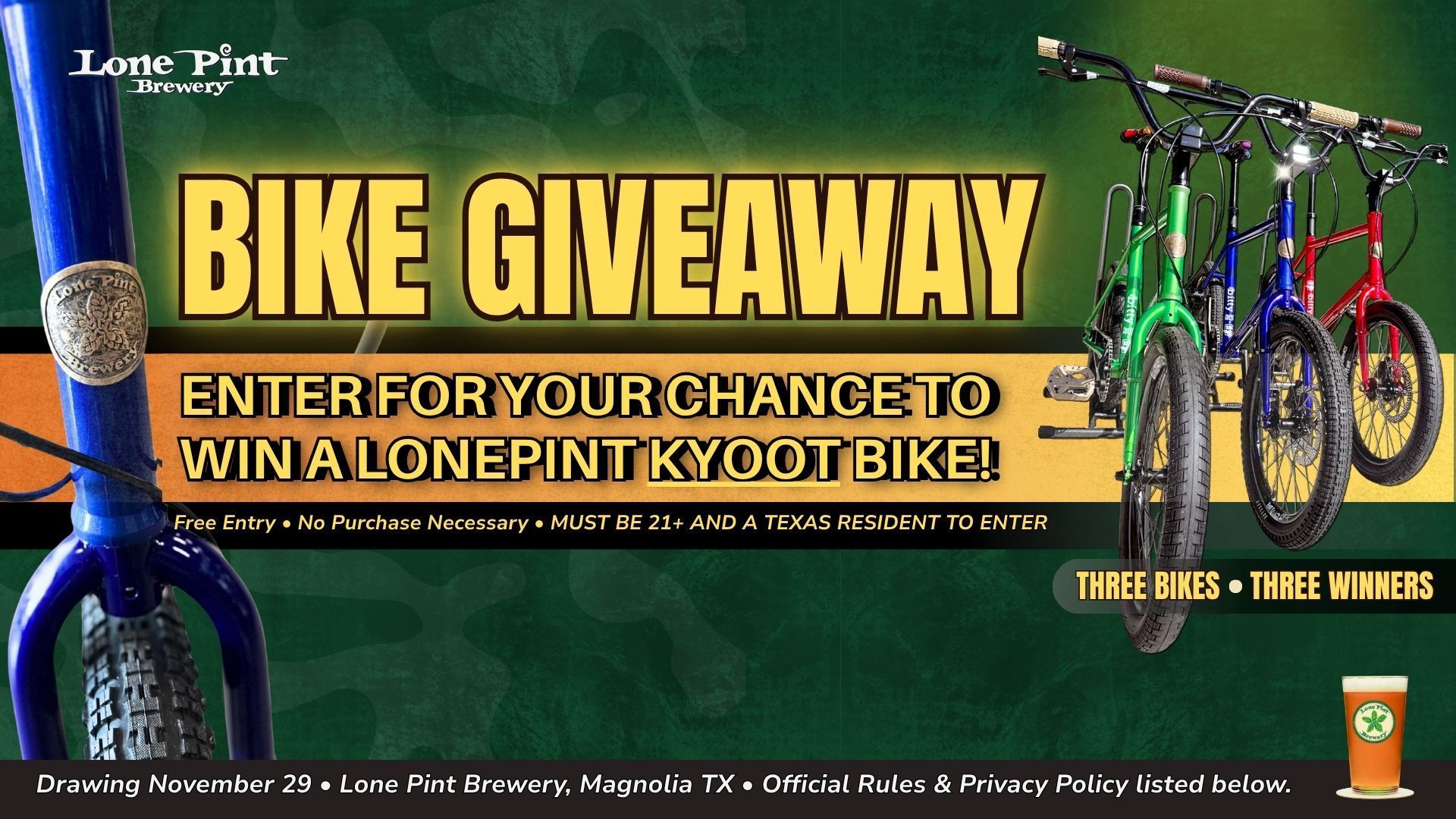 The Lone Pint Brewery Bike Giveaway is open to legal residents of Texas, aged 21 or older at the time of entry. Employees of Lone Pint Brewery, its affiliates, subsidiaries, advertising and promotion agencies, and their immediate family members and household members are not eligible.